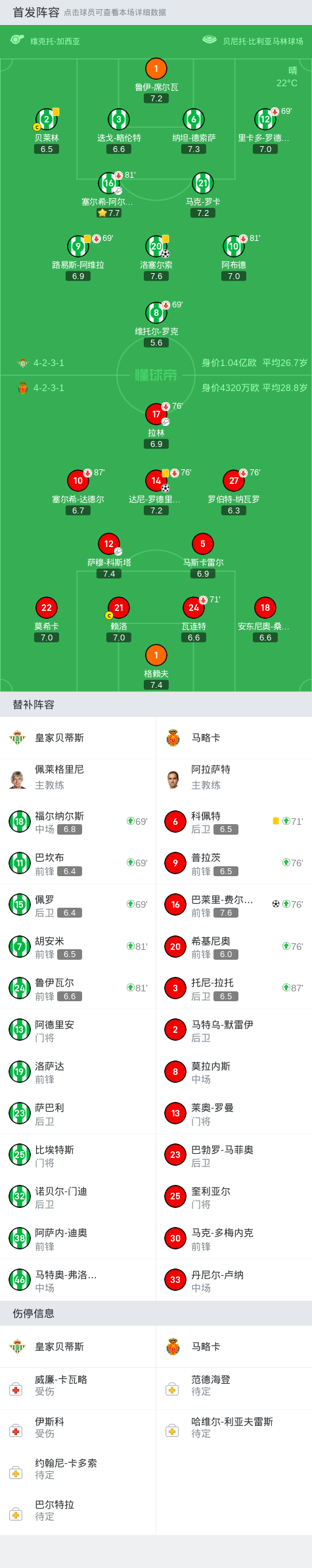 北京时间9月24日,西班牙足球甲级联赛第6轮,皇家贝蒂斯主场迎战马略卡。上半场,洛塞尔索外围一脚世界波破门先拔头筹,随后,拉林助攻达尼-罗德里格斯破门还以颜色。洛塞尔索铲球犯规被出示红牌,VAR回看后取消红牌改判黄牌。罗伯特-纳瓦罗越位,进球被吹无效。下半场,角球开出,巴莱里-费尔南德斯后点破门。最终马略卡客场2-1逆转皇家贝蒂斯。