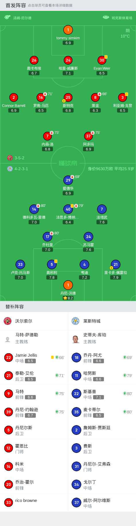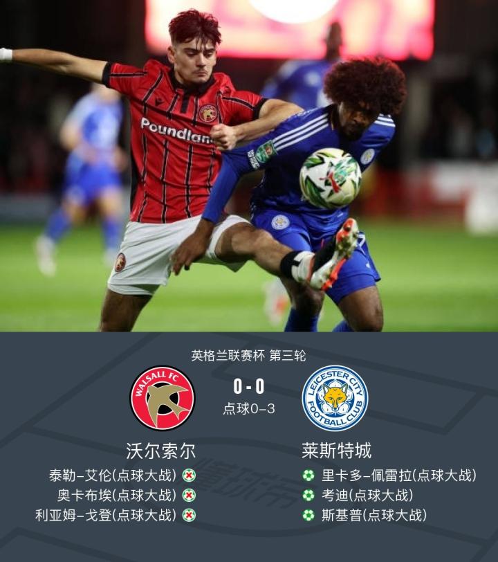 北京时间9月25日英格兰联赛杯 第三轮,沃尔索尔对阵莱斯特城。比赛中莱金禁区跟进推射打门,皮球被丹尼-沃德扑出,法昆多-博纳诺特抢点头球攻门偏出,法武塔突破抽射近角击中边网,常规时间两队战成平局,随后点球大战丹尼-沃德三连扑力保城门不失,斯基普罚入制胜点球,最终比分沃尔索尔 0-3 莱斯特城。
