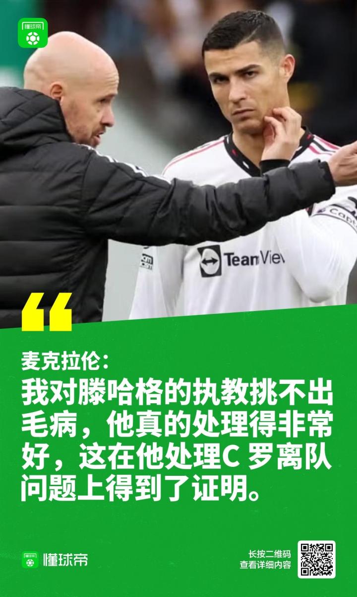 麦克拉伦表示:“我对滕哈格的执教挑不出毛病,他真的处理得非常好,我当时就说他是合适的人选,这在他处理C罗离队问题上得到了证明。”