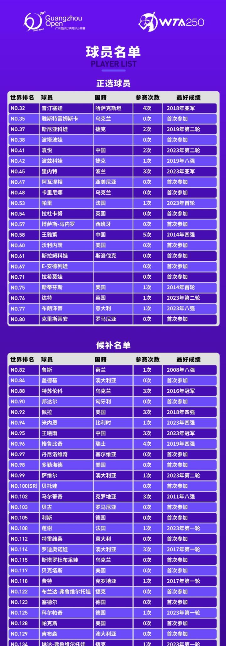 广州国际女子网球公开赛阵容:袁悦和王雅繁直接入围正赛凡尔赛小木屋 @懂球帝2024-09-25 15:399月25日,2024年WTA广州国际女子网球公开赛公布参赛阵容,袁悦、王雅繁直接入围正赛。普丁塞娃和雅斯特雷姆斯卡领衔,拉杜卡努、斯蒂文斯在列。卫冕冠军王曦雨、前赛会冠军肯宁和特苏伦科则在替补名单当中。今年是广网20周年,正赛将在10月21日到27日进行。完整阵容如下展开更多