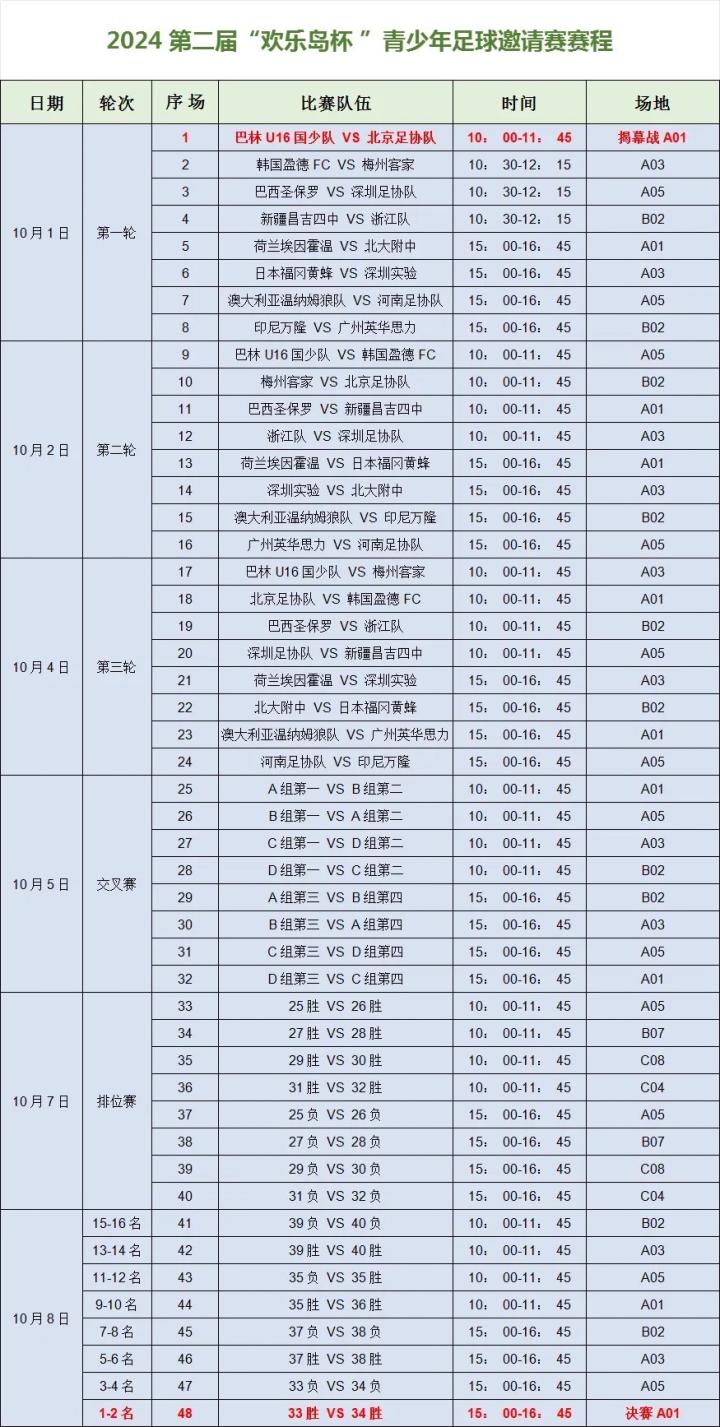 本届“欢乐岛杯”青少年足球邀请赛计划于10月1日开幕,10月8日闭幕。赛事邀请了来自4大洲(南美洲、欧洲、澳洲、亚洲)、8个国家(巴西、荷兰、巴林、日本、韩国、澳大利亚、印尼、中国)共16支高水平的球队参赛。