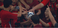皮球飞上看台后,海港球迷与足球合影