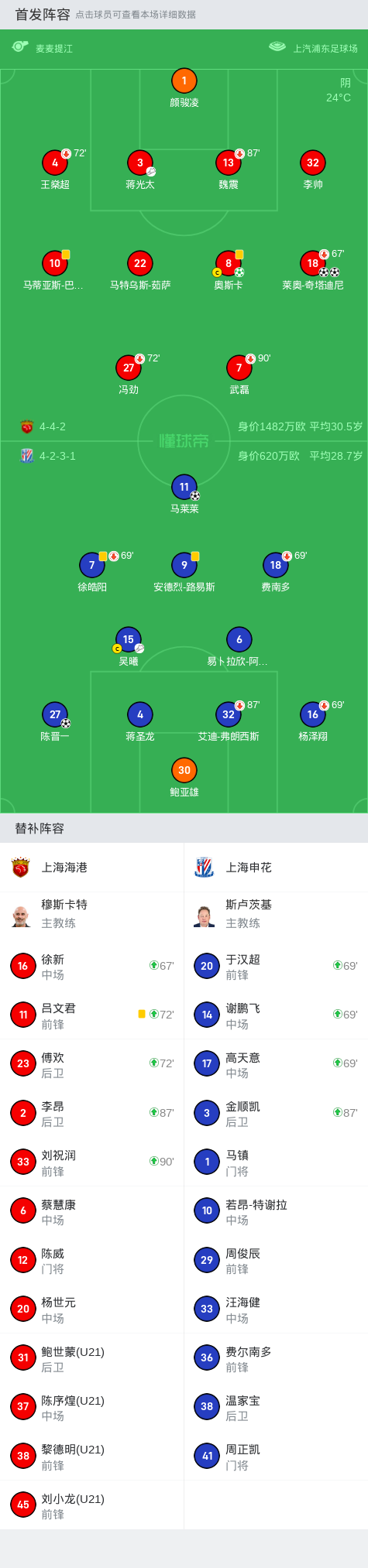 第18分钟,海港发出战术角球,奇塔迪尼门前扫射破门,海港1-0领先申花