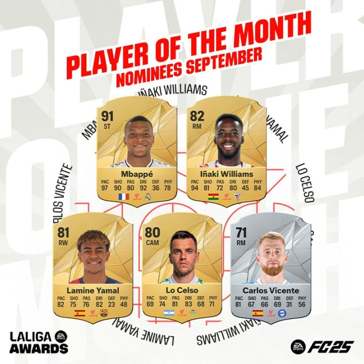 西甲官方九月最佳球员候选:姆巴佩、亚马尔入围LaPulga @懂球帝2024-09-25 23:38西甲联赛官方公布九月最佳球员候选名单,皇家马德里球星姆巴佩、巴塞罗那新星亚马尔入围。西甲官方九月最佳球员候选名单:姆巴佩 皇家马德里伊尼亚基-威廉斯 毕尔巴鄂竞技亚马尔 巴塞罗那洛塞尔索 皇家贝蒂斯卡洛斯-比森特 阿拉维斯在九月的西甲比赛中,巴塞罗那目前依然保持着全胜的战绩,亚马尔场场比赛参与进球,而皇家马德里也取得了连胜,姆巴佩连场有进球入账。展开更多