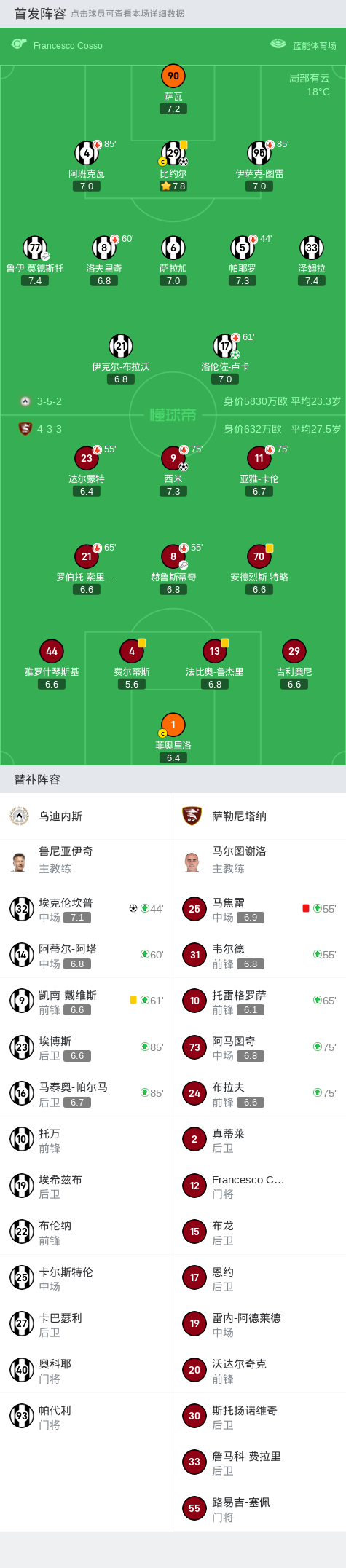 乌迪内斯3-1萨勒尼塔纳,洛伦佐-卢卡点射,埃克伦坎普破门