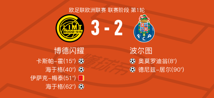 在欧足联欧洲联赛联赛阶段的首轮比赛中,博德闪耀迎战波尔图。比赛一开始,波尔图的弗朗西斯科-莫拉助攻奥莫罗迪翁率先打入一球。随后,博德闪耀的海于格助攻卡斯帕-霍扳平比分。接着,萨特纳斯助攻海于格再下一城,帮助博德闪耀反超。 比赛进入下半场,博德闪耀的伊萨克-梅泰因累计两张黄牌被罚下场。尽管如此,博德闪耀依然表现出色,卡斯帕-霍再次助攻海于格,后者完成梅开二度。比赛接近尾声时,波尔图的德尼兹-居尔打入一球,但未能改变比赛结果。 最终,博德闪耀以3-2战胜波尔图,卡斯帕-霍和海于格的出色表现成为球队获胜的关键。