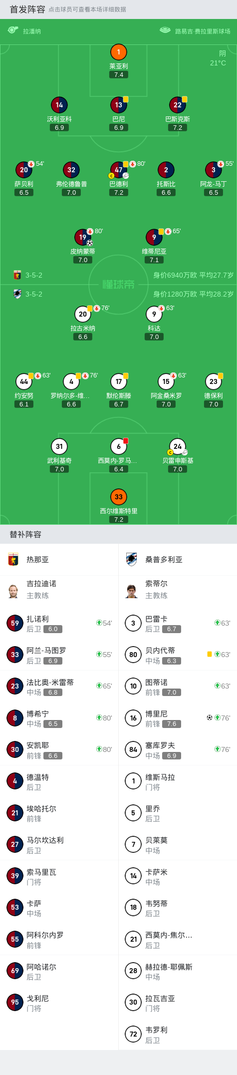 第9分钟,先拔头筹,后卫出球失误,皮纳蒙蒂低射破门,热那亚1-0