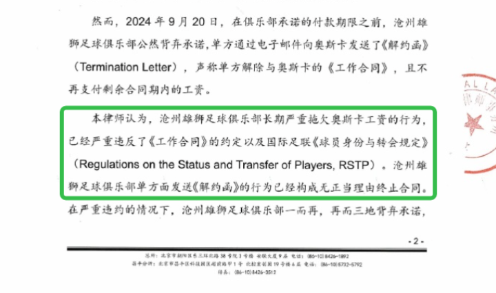 与此同时,为了保障职业球员权益,FIFA也为球员设置了相关的解约规则。除非有其他特殊情况或合同条款,如果沧州方面拖欠奥斯卡两个月及以上的薪水,奥斯卡可以以书面形式通知沧州雄狮违约。如果沧州雄狮没有在15天内履行财务上义务,那么奥斯卡就将被视为有正当理由解除合同。