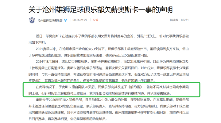 值得一提的是,该律所在律师函中表示,沧州雄狮向奥斯卡发送了《解约函》,且该行为已构成无正当理由终止合同。相反的,沧州雄狮方面则是认为奥斯卡擅自离队并提出新的回归条件,最终在其离队26天后向其发送了《解约函》。