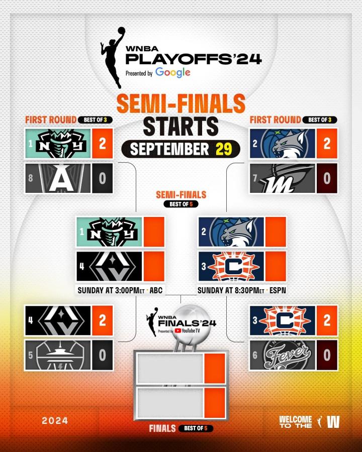 自此,WNBA季后赛半决赛对阵确定,四强中除了上述提到的两支球队外,还有早些时候晋级的纽约自由人队和拉斯维加斯王牌队。半决赛首场对决将在北京时间9月30日03:00开打,届时纽约自由人队将主场迎战拉斯维加斯王牌队。30日08:30,明尼苏达山猫队将在主场对阵康涅狄格太阳队。半决赛和总决赛都采取5局3胜制。