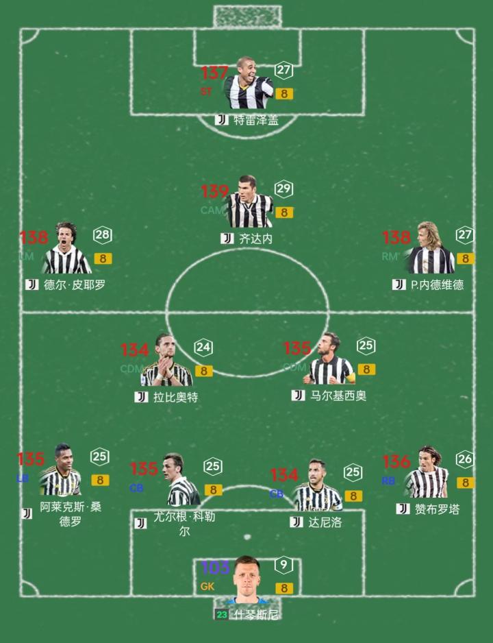 尤文大使赛季一共14名球员,工资原因,JA什琴斯尼难以上场,还剩13名球员,能凑够一套首发。这套阵容不仅价格很便宜,仅需几亿BP的成本,而且实用性高,强度不弱。另外在游戏里卡面保持一致,头像都是尤文球衣,看上去就很整齐划一。