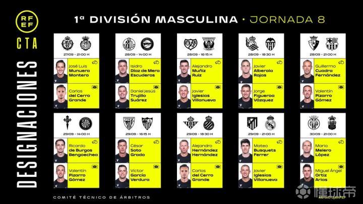 西班牙足协官方公布了西甲第8轮裁判安排,马特奥-布斯克茨将执法马德里德比,吉列尔莫-夸德拉将执法奥萨苏纳vs巴塞罗那。