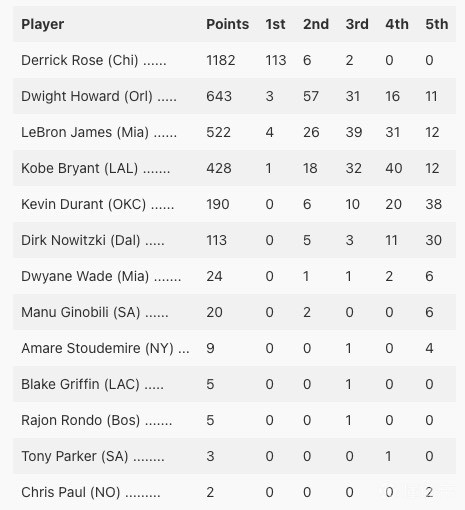 2010-11赛季MVP票选,罗斯以1182的积分排名第一,霍华德642分第二,詹姆斯522分第三。