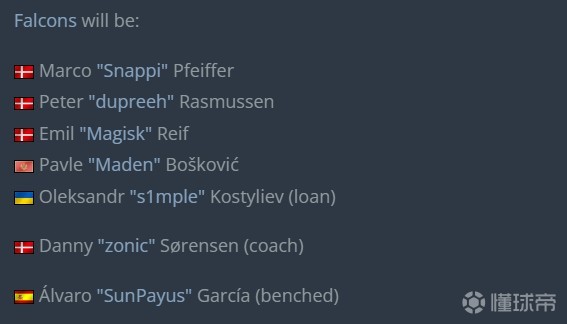 变阵后,Falcons阵容为Snappi、dupreeh、Magisk、Maden、s1mple