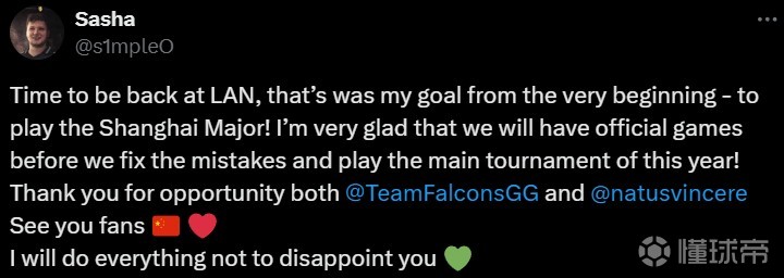 是时候回归线下赛事了,这是我从一开始的目标——参加上海Major!我很高兴我们在纠正错误并参加重大赛事之前还有比赛可打!感谢Falcons和NAVI给我这个机会。期待见到中国的粉丝们,我会尽一切所能不让你们失望。