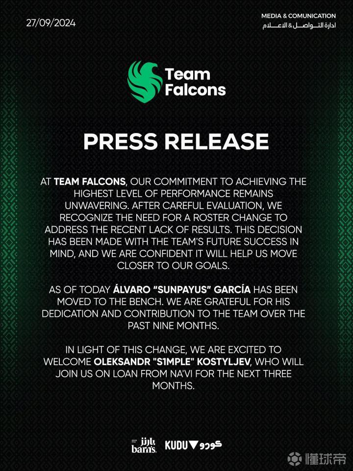 CS的GOAT回归!官方:s1mple租借加盟Falcons,太阳神被下放