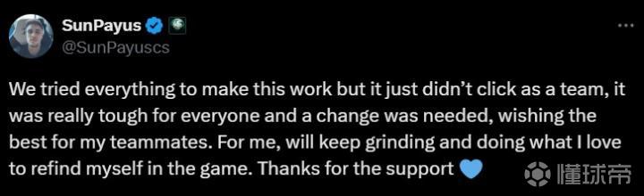 我们尽了一切努力,但作为一个团队,我们还是没有成功,这对每个人来说都很艰难,队伍需要做出改变,祝愿我的队友一切顺利。对我来说,我会继续努力,做我喜欢的事情,在游戏中重新找回自我。感谢你们的支持 。