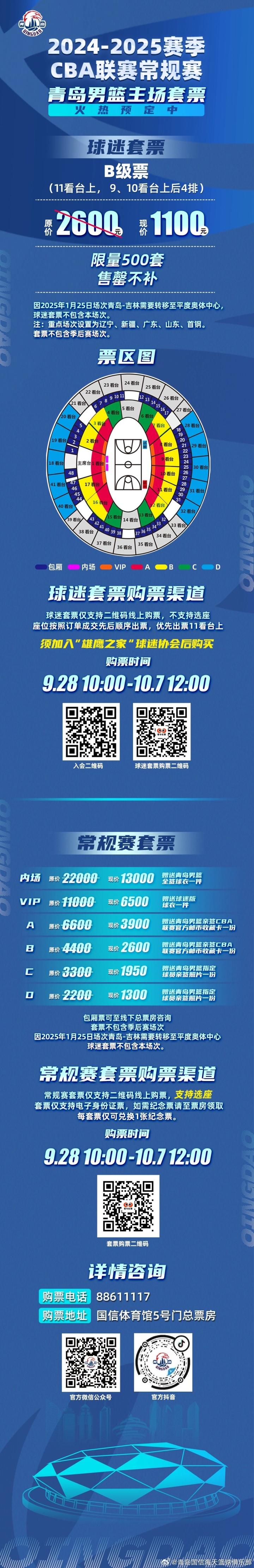 9月27日,CBA青岛男篮发布新赛季常规赛主场门票信息,球队新赛季套票将于9月28日上午10点开售。
