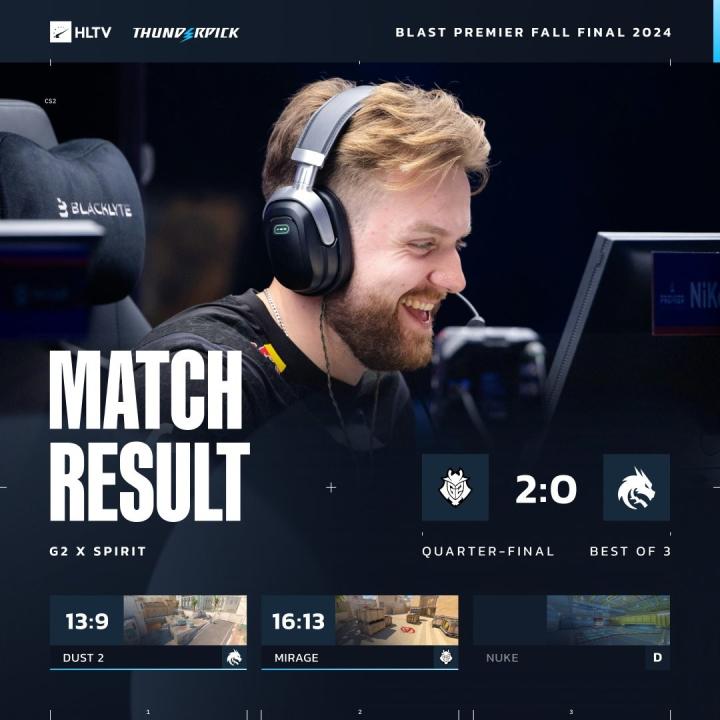 BLAST秋季决赛:G2图二逆转淘汰Spirit,半决赛将战小蜜蜂