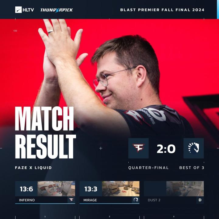 北京时间9月28日,CS2赛事BLAST秋季决赛Playoffs,FaZe干净利落2-0带走液体,晋级半决赛。