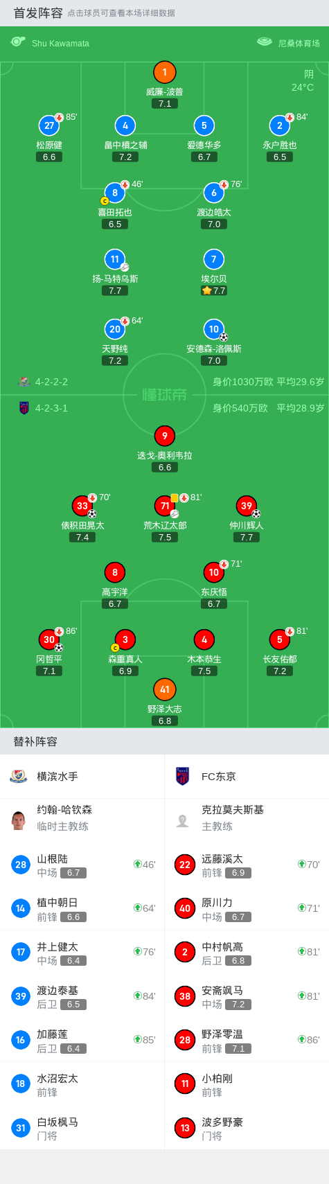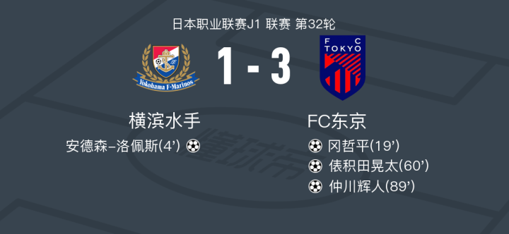 在北京时间9月28日进行的日本职业联赛J1联赛第32轮比赛中,横滨水手主场迎战FC东京。比赛一开始,横滨水手的扬-马特乌斯助攻安德森-洛佩斯率先破门,为主队取得领先。随后,FC东京的冈哲平迅速扳平比分。比赛进入下半场后,FC东京的荒木辽太郎助攻俵积田晃太,再次改写比分。临近比赛结束,FC东京的野泽零温助攻仲川辉人,锁定胜局。最终,横滨水手以1-3不敌FC东京。
