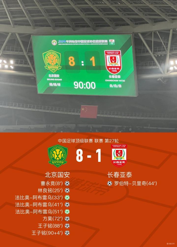 北京时间9月28日,中国足球顶级联赛第27轮,北京国安主场迎战长春亚泰。上半场,曹永竞、林良铭为国安建功,法比奥完成双响,贝里奇扳回一城,下半场,法比奥点射完成帽子戏法,替补出场的方昊建功,同样替补出场的王子铭完成梅开二度。最终,北京国安以8-1的大比分战胜长春亚泰。