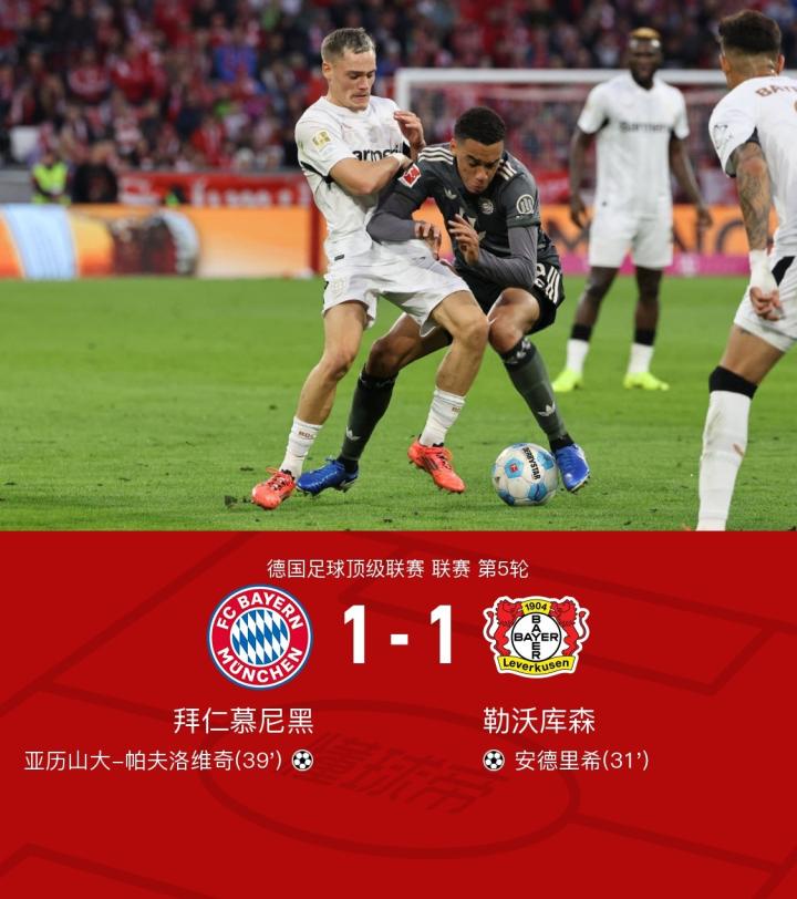 北京时间9月29日00:30,德甲第5轮焦点大战,拜仁慕尼黑坐镇主场慕尼黑安联球场迎战勒沃库森,本场主裁判为兹瓦耶。上半场,安德里希贴地斩首开记录,帕夫洛维奇回传失误送角球导致丢球后天外飞仙扳平将功补过。下半场,格纳布里两连中框,凯恩伤退。最终,拜仁主场1-1战平勒沃库森。