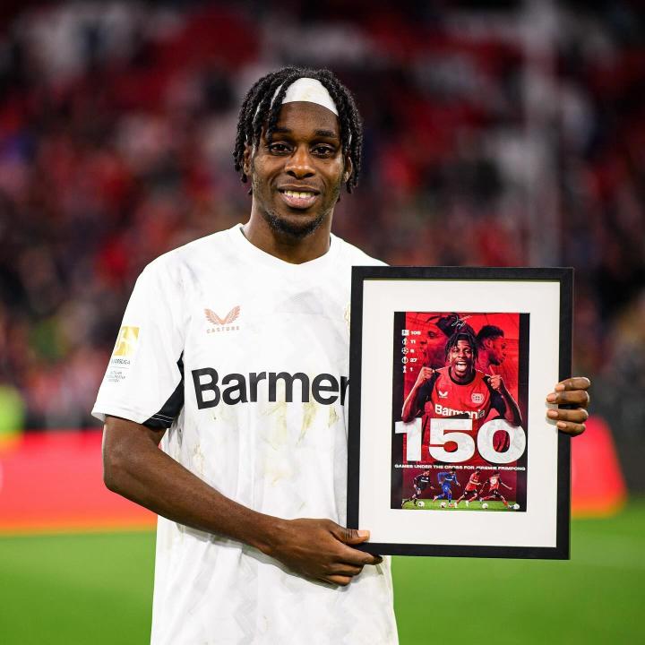 在与拜仁慕尼黑的比赛中,弗林蓬达成勒沃库森生涯150场里程碑,并获赠纪念礼物。
