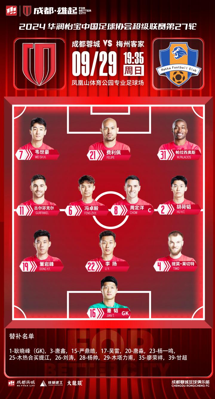 成都蓉城vs梅州客家 比赛首发名单出炉!成都,雄起!