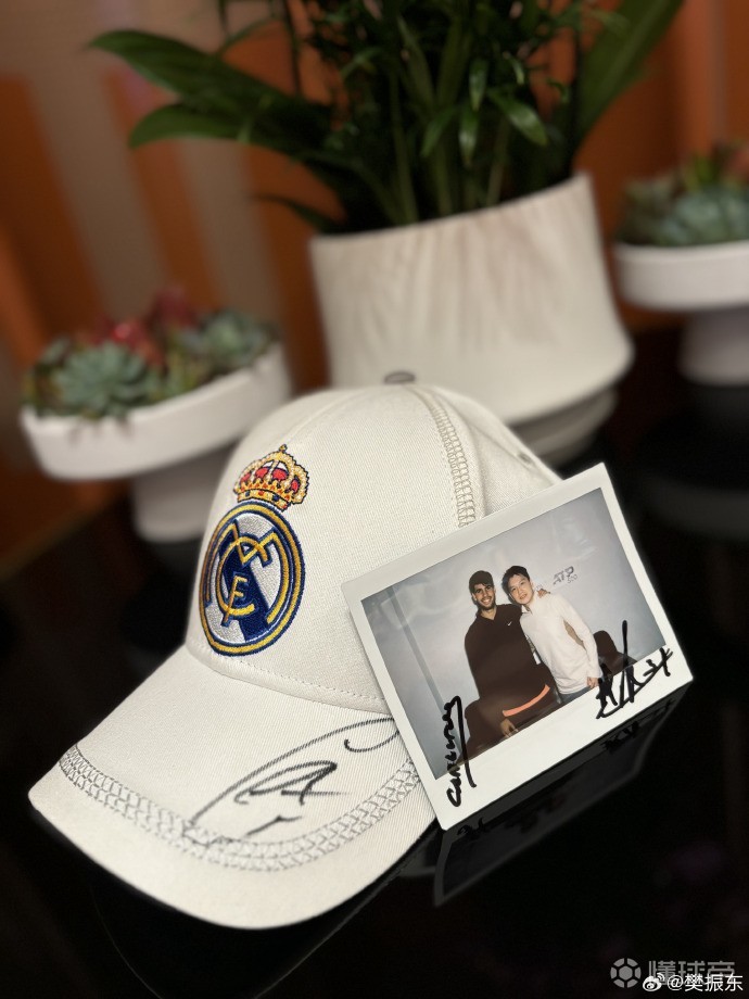樊振东与阿尔卡拉斯单独合影,并在皇马球帽上签名