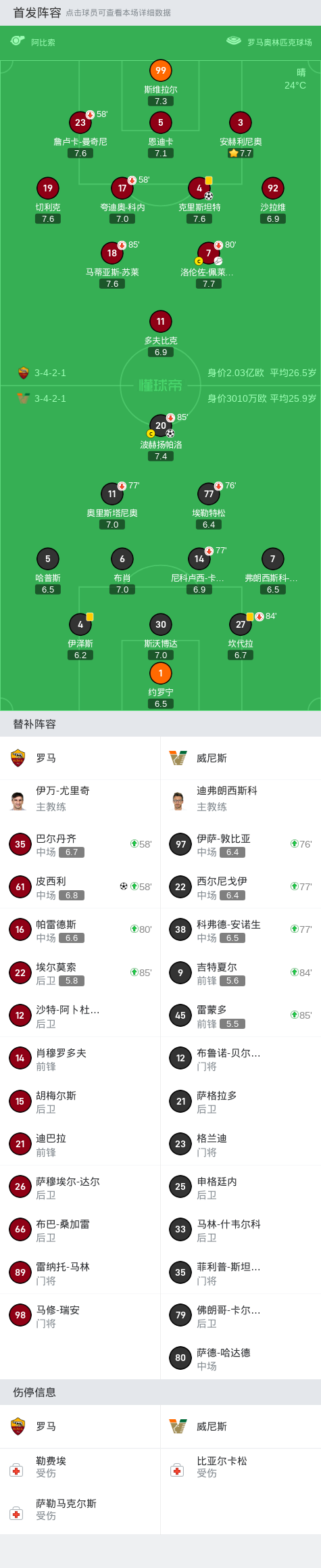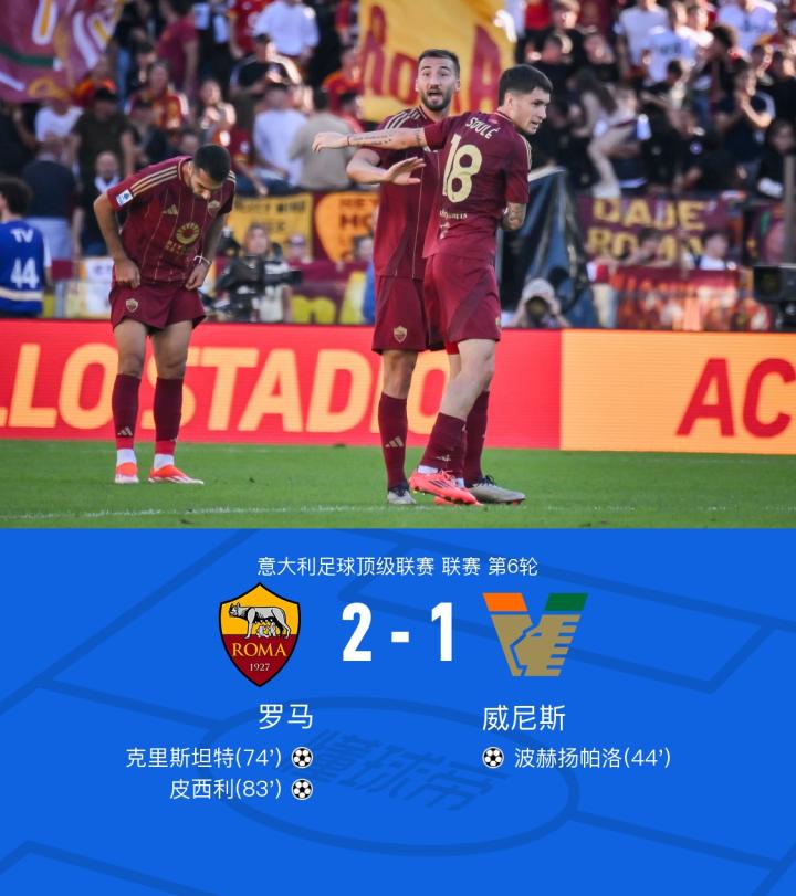 在意大利足球顶级联赛第6轮的比赛中,罗马主场迎战威尼斯。上半场波赫扬帕洛门前补射破门。下半场克里斯坦特禁区外远射,球发生折射后坠入球网,随后帕雷德斯开出角球,皮西利头球破门反超比分。最终,罗马以2-1战胜威尼斯,取得了这场比赛的胜利。