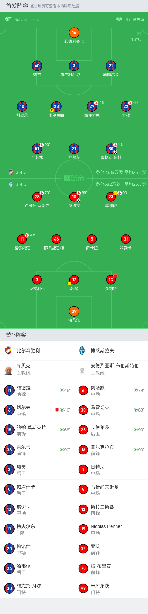 第85分钟,比尔森胜利球队切尔夫吃到红牌。