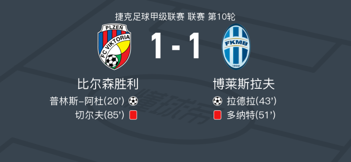北京时间9月29日,捷克足球甲级联赛第10轮,比尔森胜利主场迎战博莱斯拉夫。比赛中,比尔森胜利的普林斯-阿杜率先破门,随后博莱斯拉夫的拉德拉扳平比分。比赛过程中,博莱斯拉夫的多纳特和比尔森胜利的切尔夫分别被罚下。最终,双方以1-1握手言和。