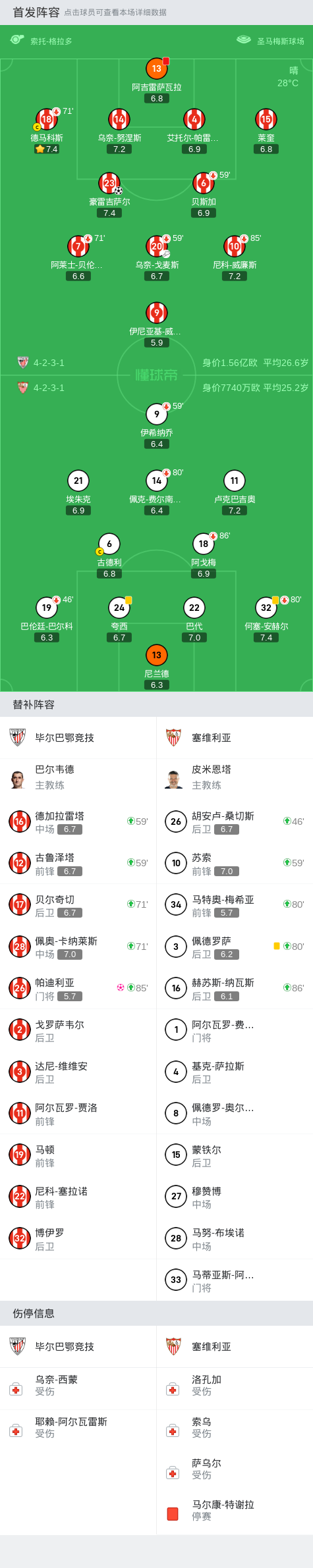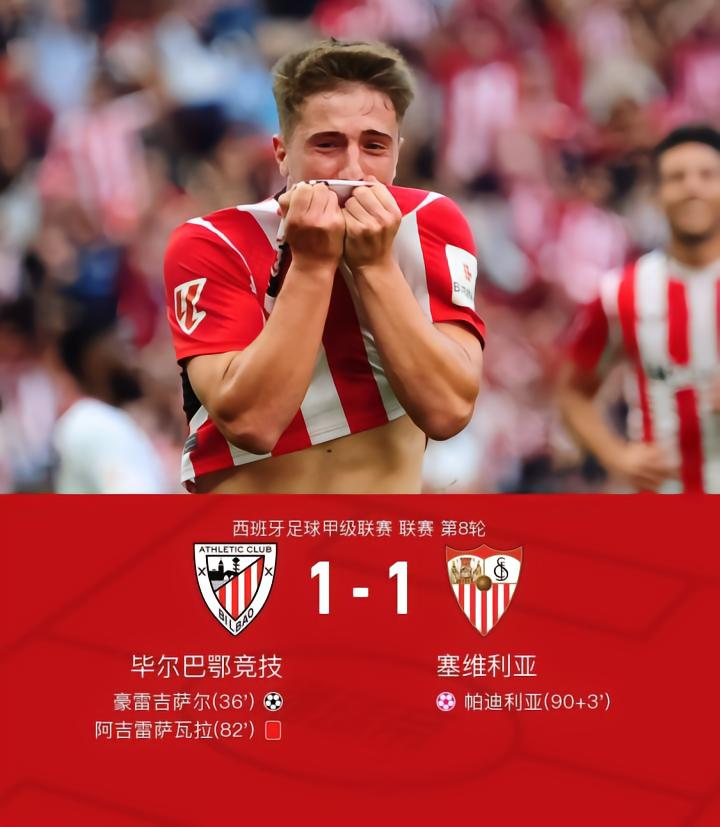 北京时间9月29日22:15,西甲联赛第8轮,毕尔巴鄂竞技主场迎战塞维利亚。上半场,尼科-威廉斯传中造险,伊尼亚基-威廉斯错失门前机会,豪雷吉萨尔跟进破门打破场上僵局;下半场,卢克巴吉奥远射击中立柱,阿吉雷萨瓦拉出击犯规被出示红牌,补时阶段,替补登场的门将帕迪利亚不慎自摆乌龙,塞维利亚绝平比分。最终,毕尔巴鄂竞技1-1战平塞维利亚。