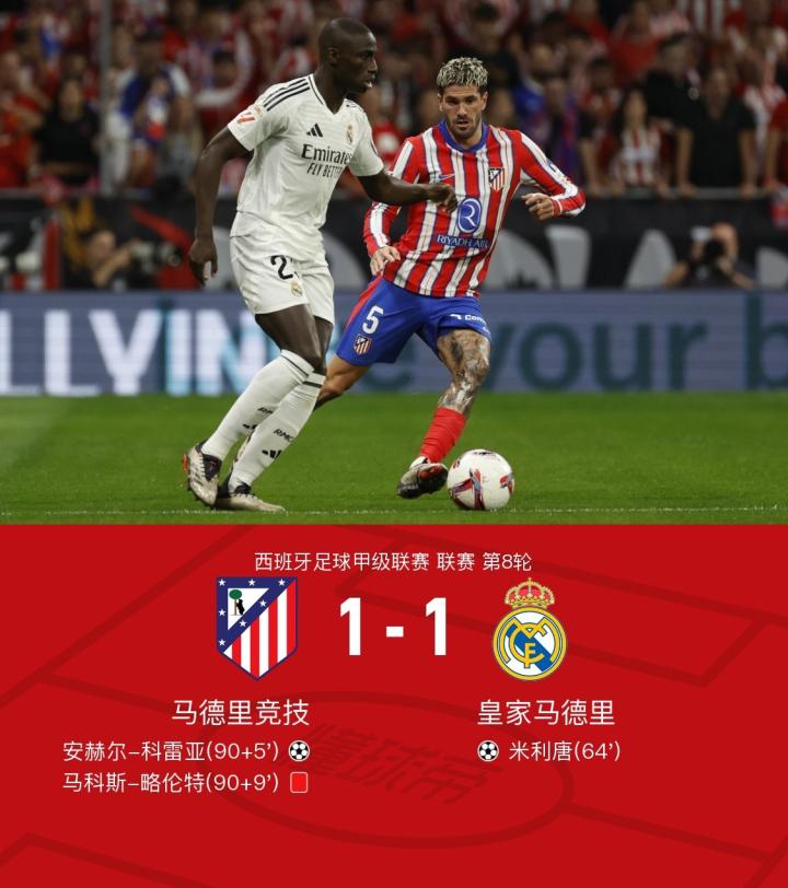北京时间9月30日03:00,西甲第8轮迎来马德里德比,马德里竞技坐镇主场西维塔斯大都会球场迎战皇家马德里,本场主裁判为布斯克茨-费雷尔。比赛中,米利唐抽射打破僵局。随后比赛因球迷投掷杂物一度中断。恢复后,安赫尔-科雷亚上演补时绝平。马科斯-略伦特被直红罚下。最终,双方以1-1战平。