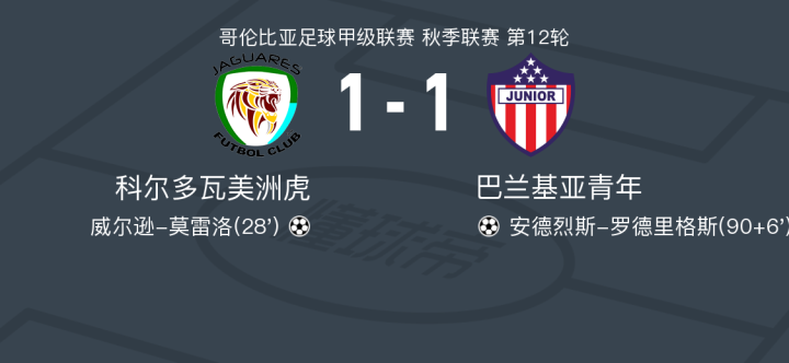 科尔多瓦美洲虎1-1巴兰基亚青年遭各项赛事3连平,威尔逊-莫雷洛先拔头筹,安德烈斯-罗德里格斯救主