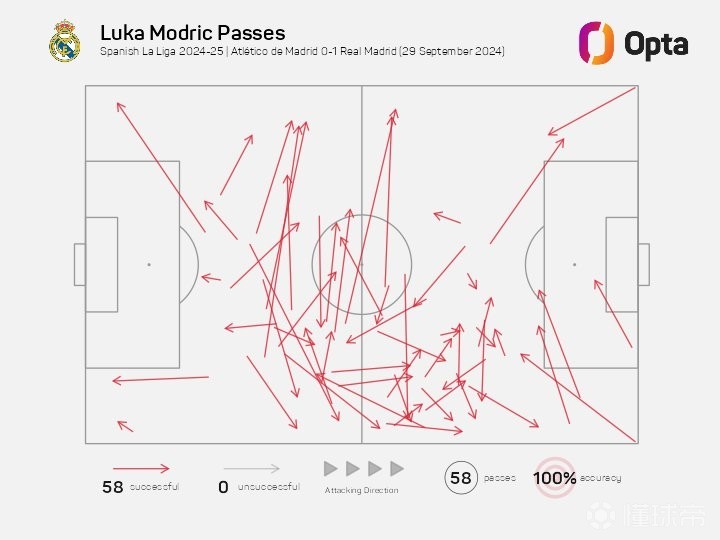 对阵阿拉维斯一役轮休之后,莫德里奇此役打出了满血状态。在86分钟的出场时间里,这位39岁的老将送出3脚威胁球,58次传球全部到位。据统计,这是莫德里奇西甲生涯(367次出场)完成百分百传递的比赛中,传球次数最多的。