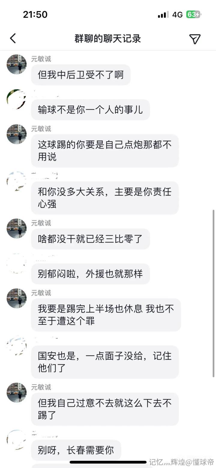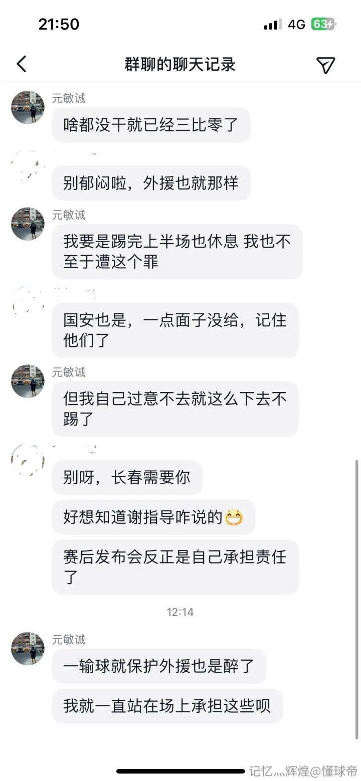 中超第27轮长春亚泰客场1-8惨败给北京国安,遭遇队史最大比分失利。随后,懂球帝用户@记忆灬辉煌 在长春亚泰圈里贴出了疑似(长春亚泰中后卫)元敏诚在抖音粉丝群内的言论——“这就是耻辱,职业生涯从来没被这么糟蹋过。一输球就保护外援也是醉了,我就一直站在场上承担这些呗。”