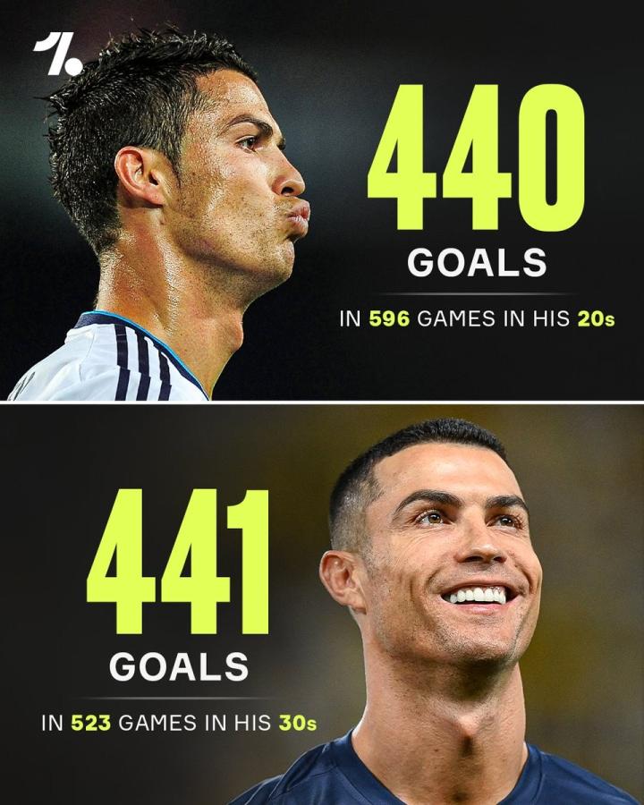 据数据统计显示,C罗在30岁之后踢的523场比赛中,已经打进了441个球,超越了他在20-30岁之间的总进球数。