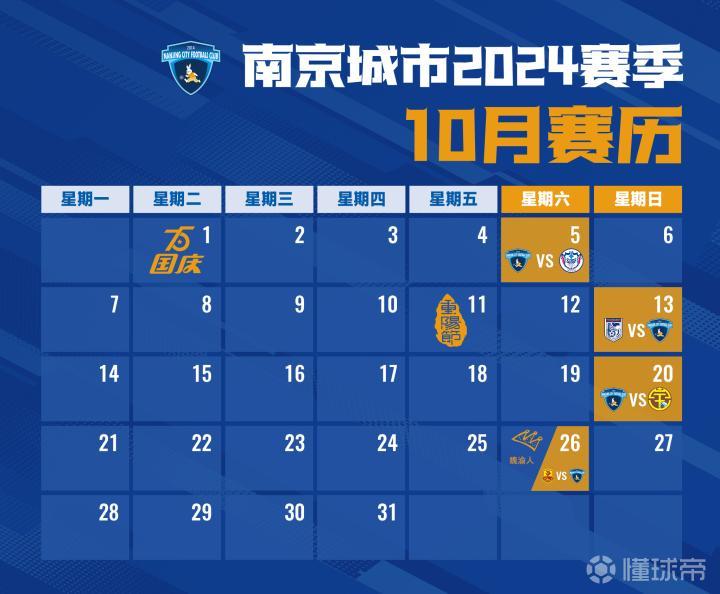 赛历丨十月红叶舞秋风 勤奋耕耘收获盈 足球不仅仅是一项运动,更是一种生活的态度。它教会我们坚持与拼搏,教会我们面对困难时永不放弃。而十月,正是这样一个充满挑战与机遇的季节,它让每一个热爱足球的人,都能在这片绿茵场上找到属于自己的那份感动与成长。从本赛季开始,南京城市足球俱乐部将为球迷朋友们带来全新赛历,以便球迷朋友们随时查阅比赛相关信息,欢迎大家关注! 南京城市的将士们将在十月迎来四场比赛。本周六,球队将在主场进行与石家庄功夫的比赛;随后在10月13日将前往大连,在客场迎战大连英博;10月20日,球队将坐镇主场,迎战广西平果哈嘹;10月26日,球队将奔赴青岛,迎来与青岛红狮的对决。燥热褪去,金秋送爽,希望球队可以在美好的十月里寻找到胜利的节奏,谱写胜利的乐章!也期待广大球迷朋友们在这个美好的时节里,和我们一起追寻胜利的脚步!
