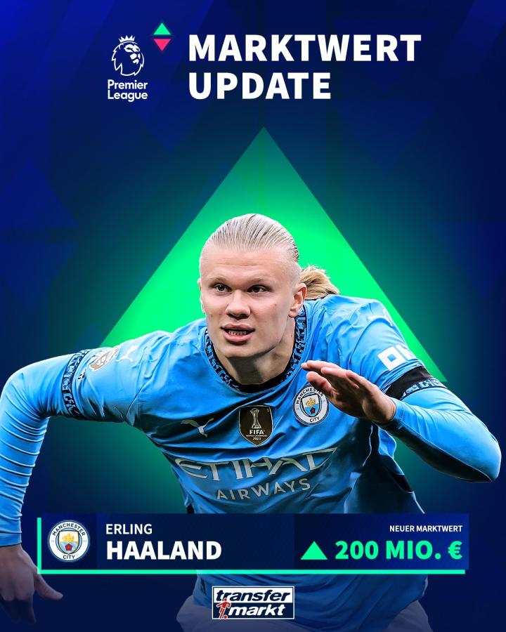 世界足坛的历史最高身价纪录为2亿欧元,此前仅有姆巴佩一人达成过该成就,此次哈兰德追平了德转最高身价纪录,也追平了姆巴佩的历史最高身价。