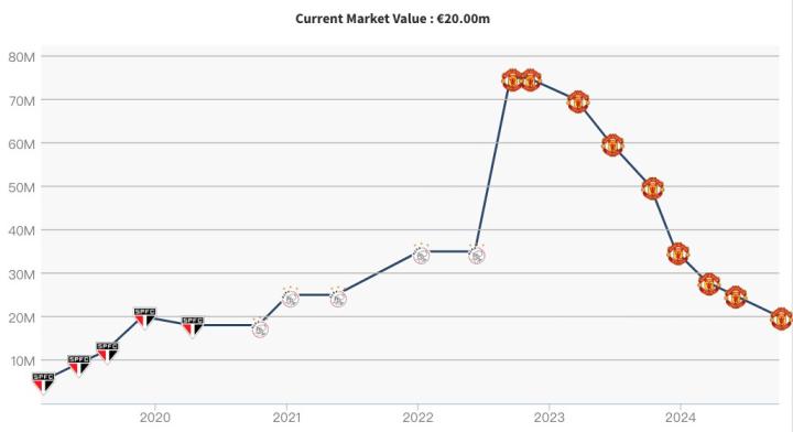 但从2023年3月开始,安东尼的德转身价经历了七连跌,从7500万欧一路跌至如今的2000万欧,这是安东尼自2020年1月以来的最低身价。
