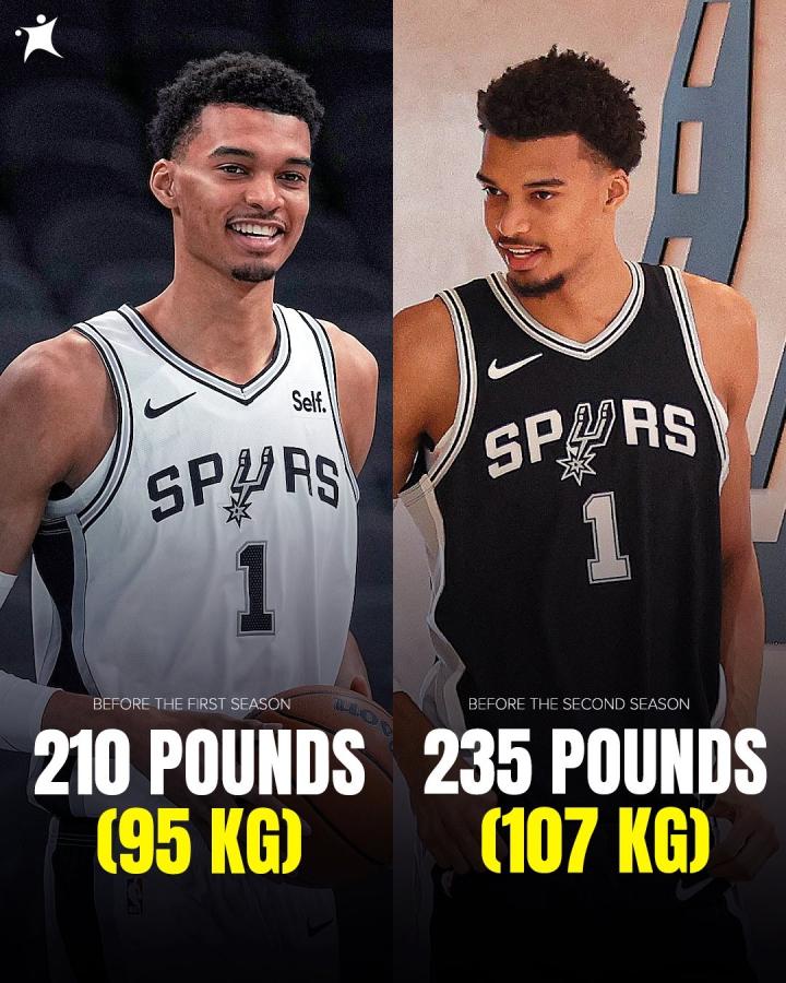 在文班亚马的新秀赛季开始之前,他的体重为210磅(约95公斤);而在他的第二个赛季24-25赛季即将到来之际,他已经增重了12公斤,来到了235磅(约107公斤)。