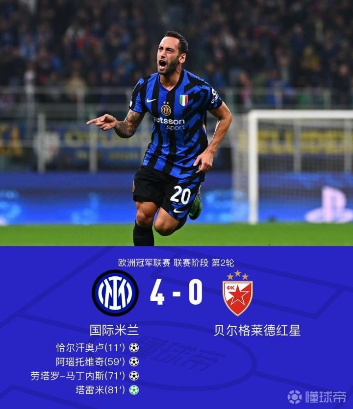 【国米4-0贝尔格莱德红星,塔雷米1射2传,恰20、劳塔罗建功】