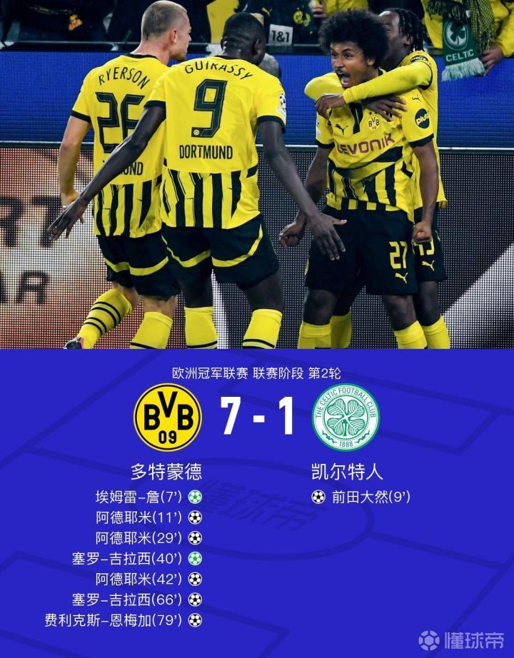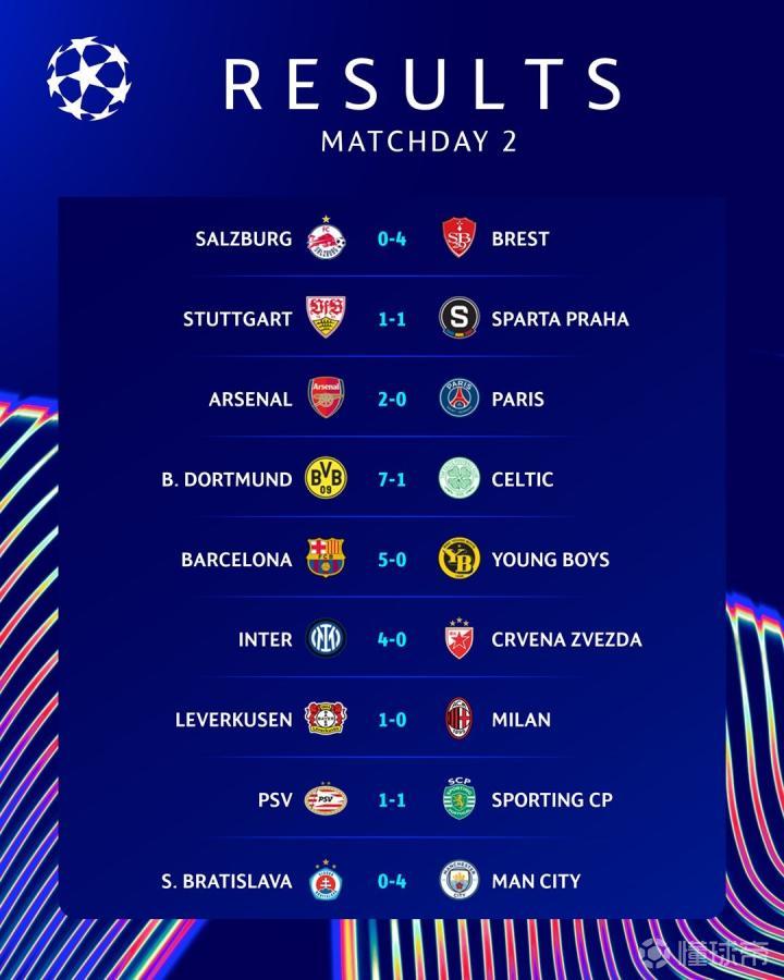 球迷朋友们早上好,欢迎收看10月2日的懂球帝早报。在刚刚结束的欧冠第二轮首个比赛日中,有5场比赛出现了四球起步的大胜,多特蒙德7-1大胜暂时登顶。