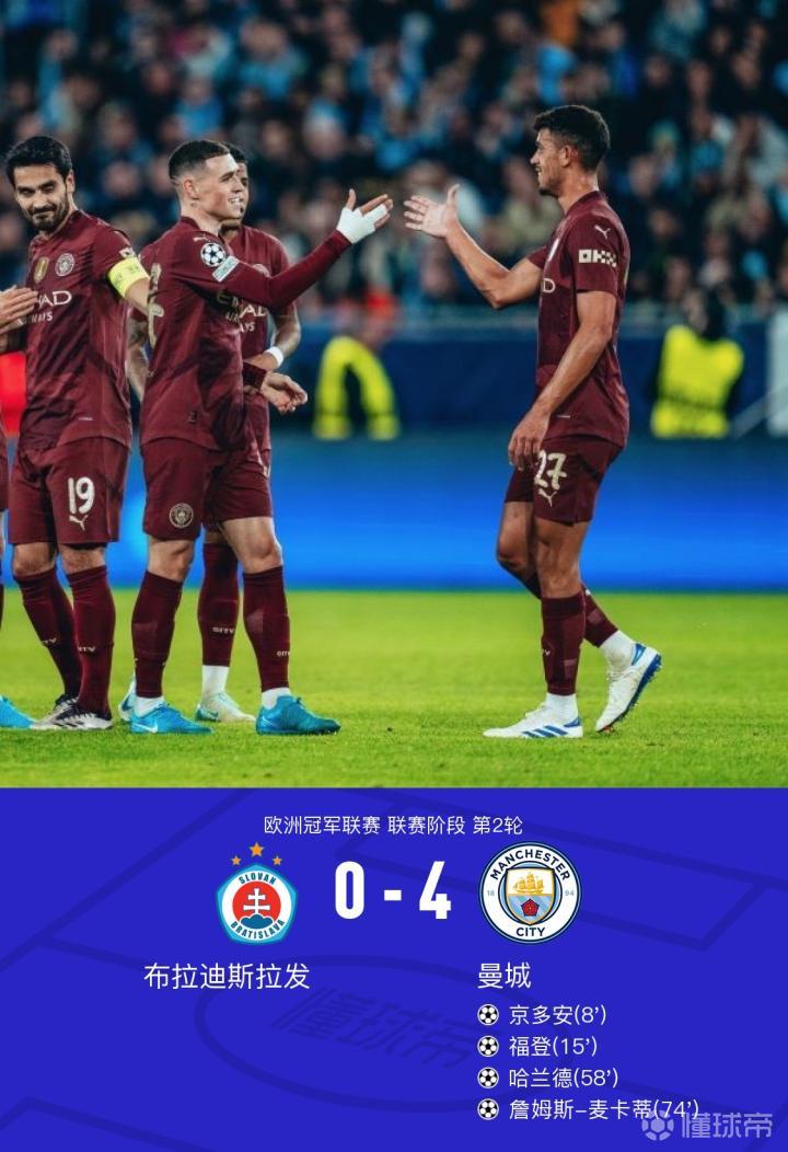 【曼城4-0布拉迪斯拉发,哈兰德破门,福登传射,京多安建功】