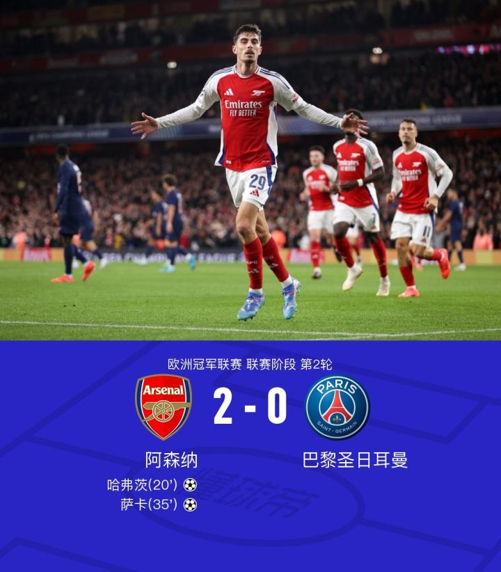 在欧洲冠军联赛联赛阶段的第2轮比赛中,阿森纳迎战巴黎圣日耳曼。上半场哈弗茨头球破门,门德斯远射中柱,萨卡任意球转进球门,下半场马丁内利连丢良机,内维斯中框,李刚仁远射被扑。最终,阿森纳以2-0战胜巴黎圣日耳曼,取得了这场关键比赛的胜利。