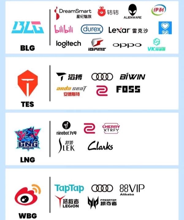 BLG:转转(二手买卖平台)、外星人(戴尔旗下品牌)、伊利、bilibili、杜蕾斯、比心(陪玩平台)、罗技、oppo等