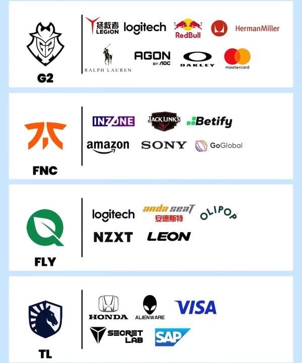 G2:拯救者(联想旗下品牌)、罗技、红牛、赫曼米勒(著名家具品牌)、拉夫劳伦、爱攻、奥克利、万事达
