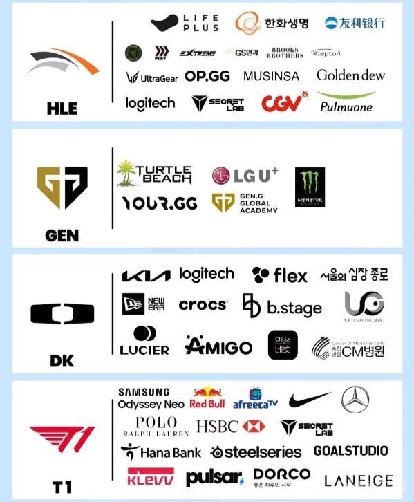 HLE:韩华生命(保险品牌)、友利银行、雷蛇、OP.GG(LOL数据查询网站)、罗技、Secret Lab(电竞椅品牌)、CGV(韩国电影院品牌)等